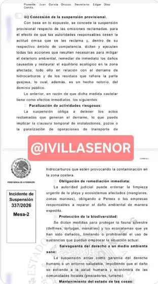 Entretanto, un juez federal otorgó suspensión provisional en el amparo 337/2026 y ordenó la clausura inmediata de pozos petroleros y frenar la infraestructura de transporte de hidrocarburos para contener la contaminación en Coatzacoalcos.